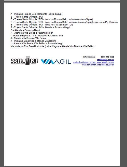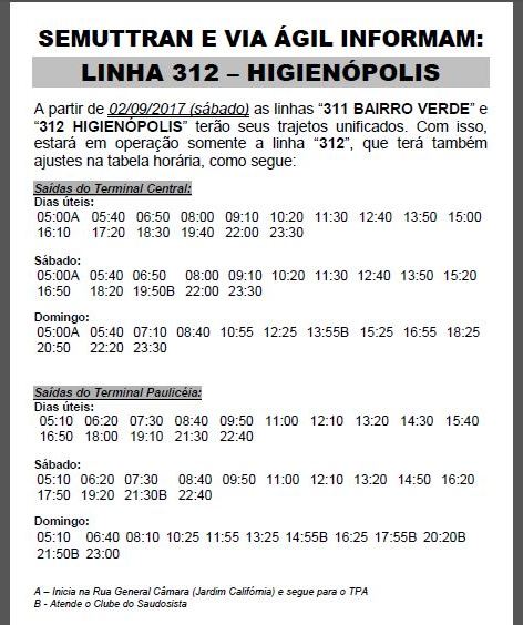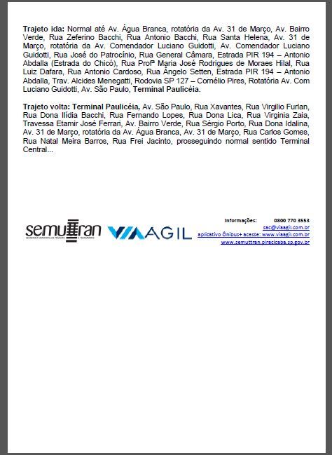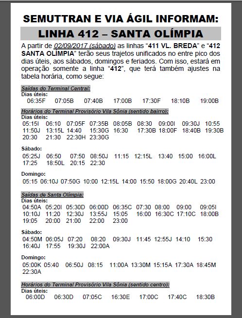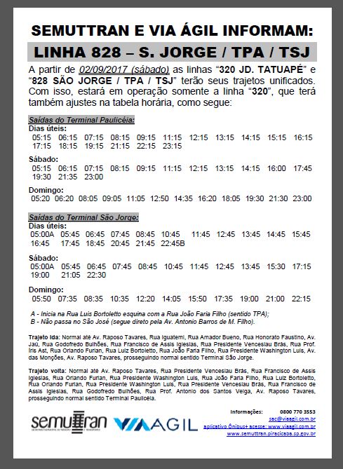 A Secretaria Municipal de Trânsito e Transportes (Semuttran) e a empresa Via Ágil unificaram os trajetos de oito linhas de ônibus. A medida adotada pela Pasta e a empresa compreende as linhas 021 (Monte Alegre) e 246 (Carlos Botelho), 311 (Bairro Verde) e 312 (Higienópolis), 320 (Jardim Tatuapé) e 828 (São Jorge/ TPA/ TSJ), além da 411 (Vila Breda) e 412 (Santa Olímpia). Segundo a Semuttran, a alteração deve melhorar o atendimento aos usuários do transporte coletivo.