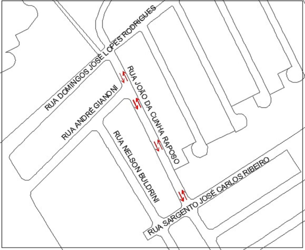 E as vias de sentido único que serão alteradas para sentido duplo são a rua João da Cunha Raposo (trecho da rua Domingos José Lopes Rodrigues até a rua Nair Bertolotti Stocco).