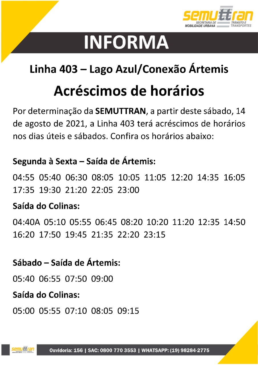 Semuttran informa: Linha 403- Lago Azul/Conexão Ártemis