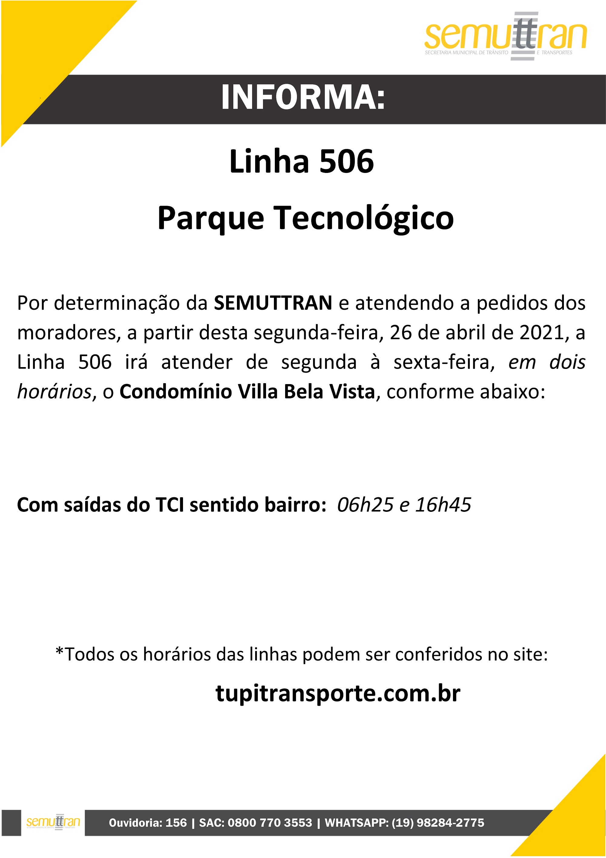 A Secretria de Trânsito e Transportes, atendendo aos pedidos dos moradores do Condomínio Bella Vista, irá disponibilizar a partir de segunda-feira, 26 de abril, dois horários de ônibus, a linha 506 sairá do Terminal Central de Integração em dois horários, confira: