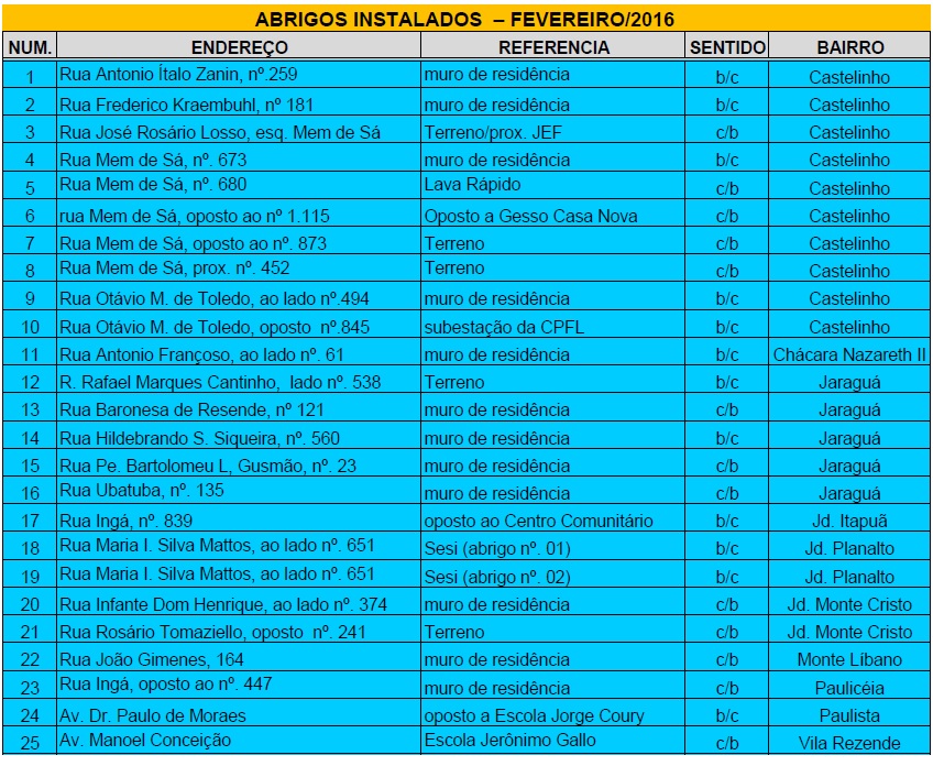 No mês de fevereiro (2016), o Departamento de Transportes Públicos da Semuttran realizou a instalação de mais 25 novos abrigos de ônibus no município. Com isso, totalizamos 150 equipamentos instalados a partir do segundo semestre de 2015, de uma licitação que prevê mais outros 150 abrigos para serem instalados nos próximos quatro meses. O total será de 300 equipamentos adquiridos.