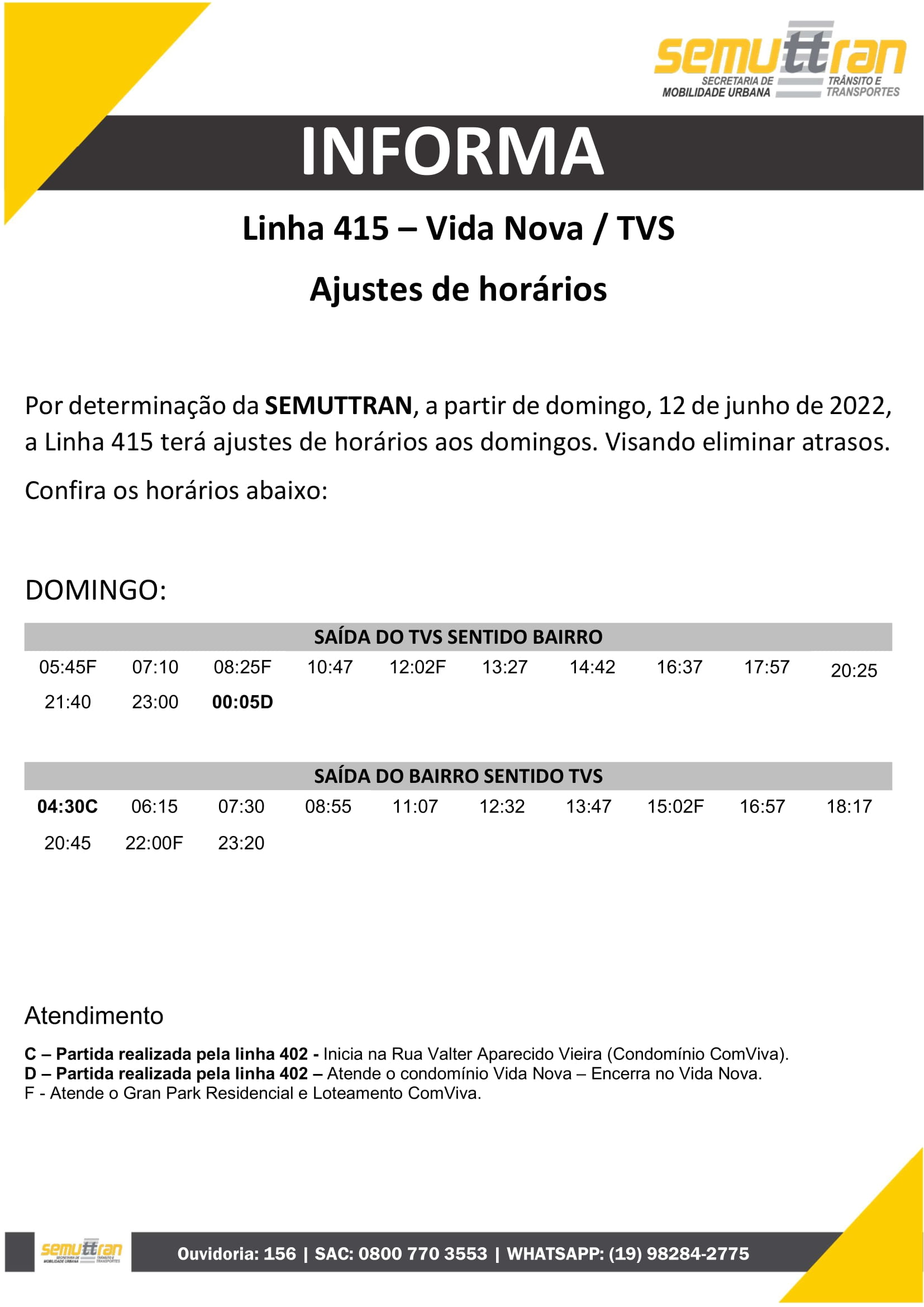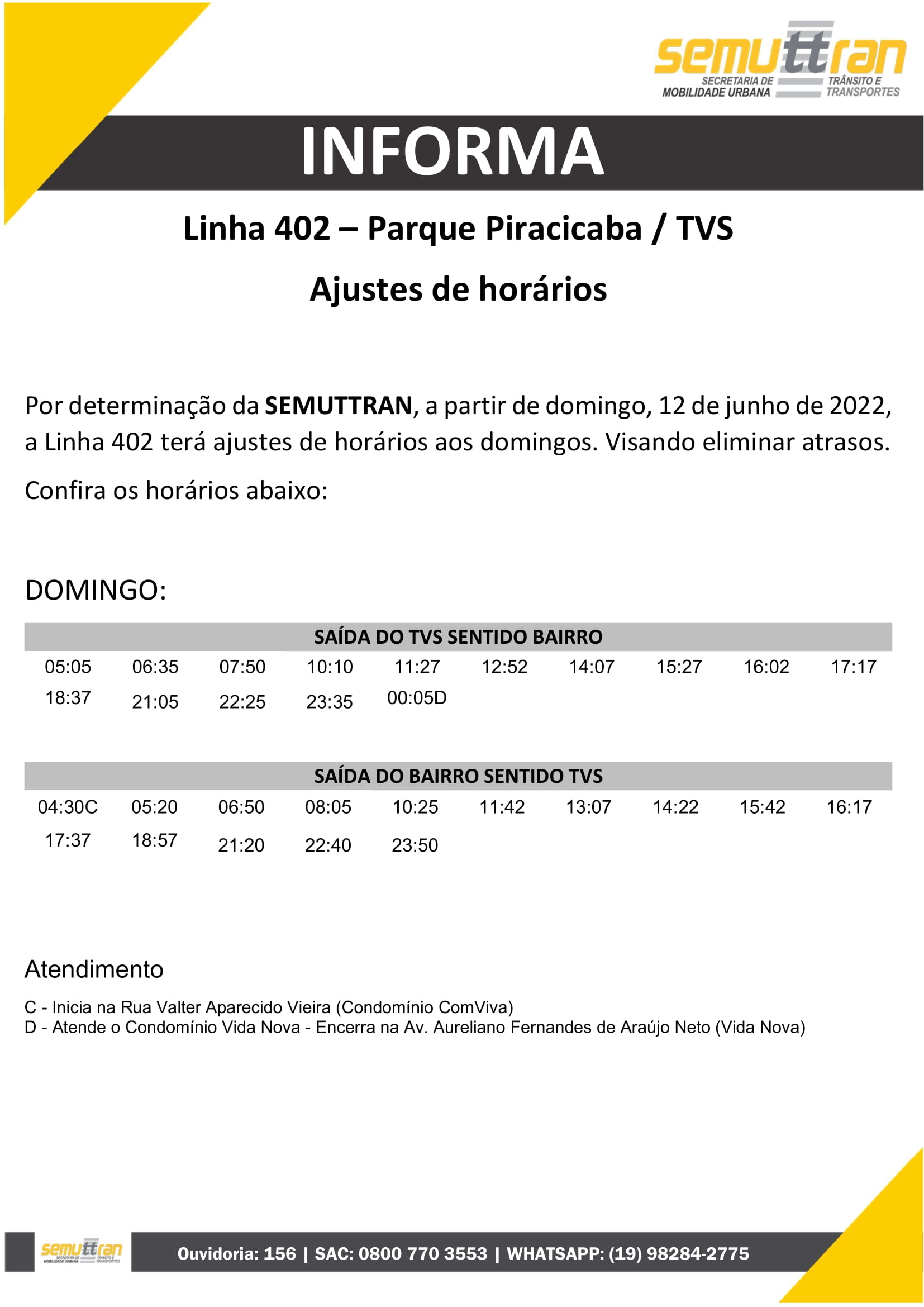 A Prefeitura de Piracicaba, por meio da Secretaria Municipal de Urbana, Trânsito e Transportes (Semuttran), realizará ajustes nos horários de domingo das linhas 402 – Parque Piracicaba e 415 – Vida Nova, que saem do Terminal Vila Sônia. Os ajustes já serão realizados a partir do próximo domingo, 12/06.