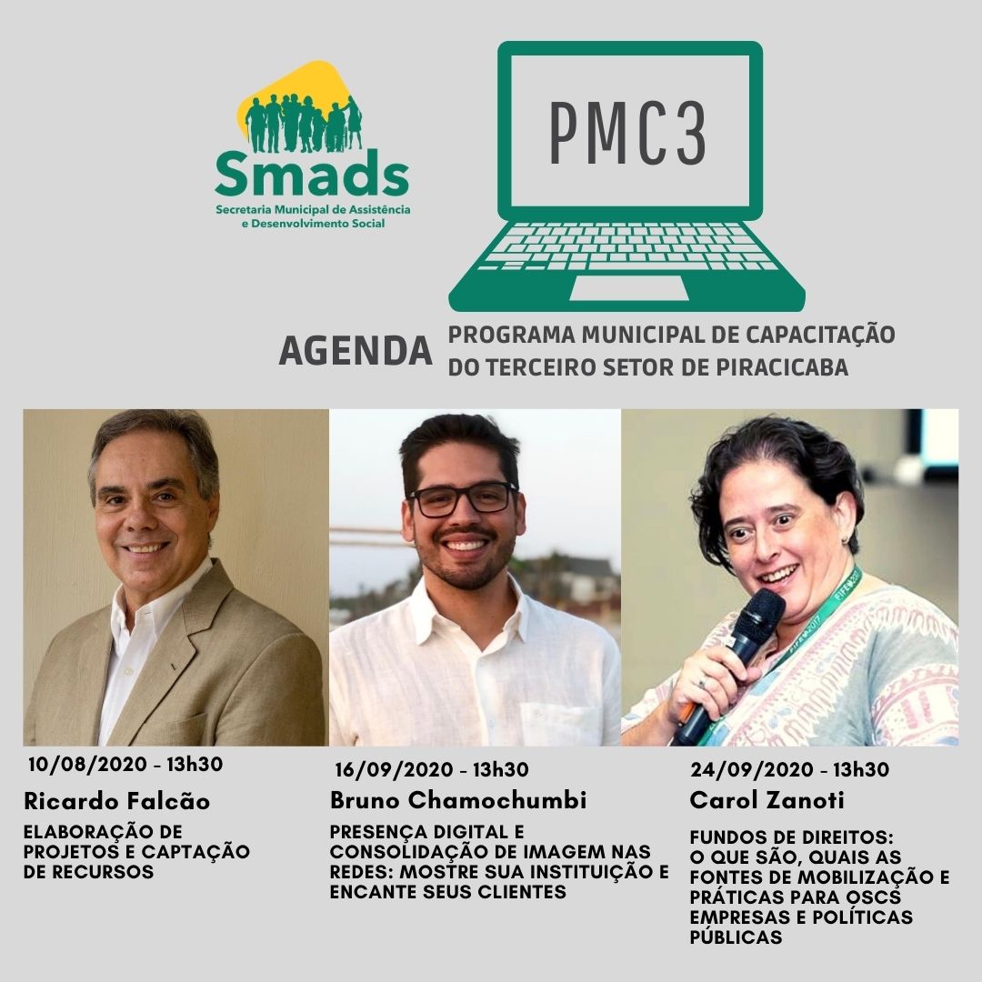 Piracicaba, 07 de agosto de 2020 – A Secretaria Municipal de Assistência e Desenvolvimento Social (Smads) inicia na próxima segunda-feira (10), às13h30, o Programa Municipal de Capacitação do Terceiro Setor de Piracicaba (PMC3), encontros online fechados online via zoom para as Organizações da Sociedade Civil que executam serviços em parceria com a Smads ou projetos financiados com recursos do Fundo Municipal dos Direitos da Criança e do Adolescente (Fumdeca). Os encontros serão dirigidos por especialistas em assuntos importantes para o cotidiano e o desenvolvimento de novos projetos das instituições sociais de Piracicaba.