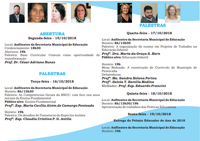 A programação terá sequência na quarta-feira com a palestra “A organização do ensino em Projetos de Trabalho na Educação Infantil”, com a professora doutora Maria da Graça S. Horn, que será apresentada às 8h e às 13h30. Às 19h, haverá mesa redonda com o tema “A construção do currículo do município de Piracicaba”, que trará ao debate a coordenadora da Educação Infantil da SME, Sandra Perina e a coordenadora do Ensino Fundamental da pasta Salvia Barella Medina. O mediador será o professor Eduardo Francini.