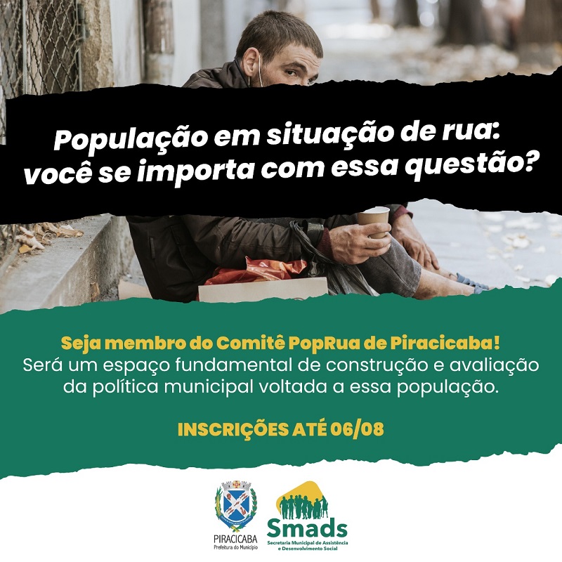 Acesso ao edital: http://smads.piracicaba.sp.gov.br/sociedade-civil-pode-se-inscrever-para-comite-poprua-de-02-a-06-08/
