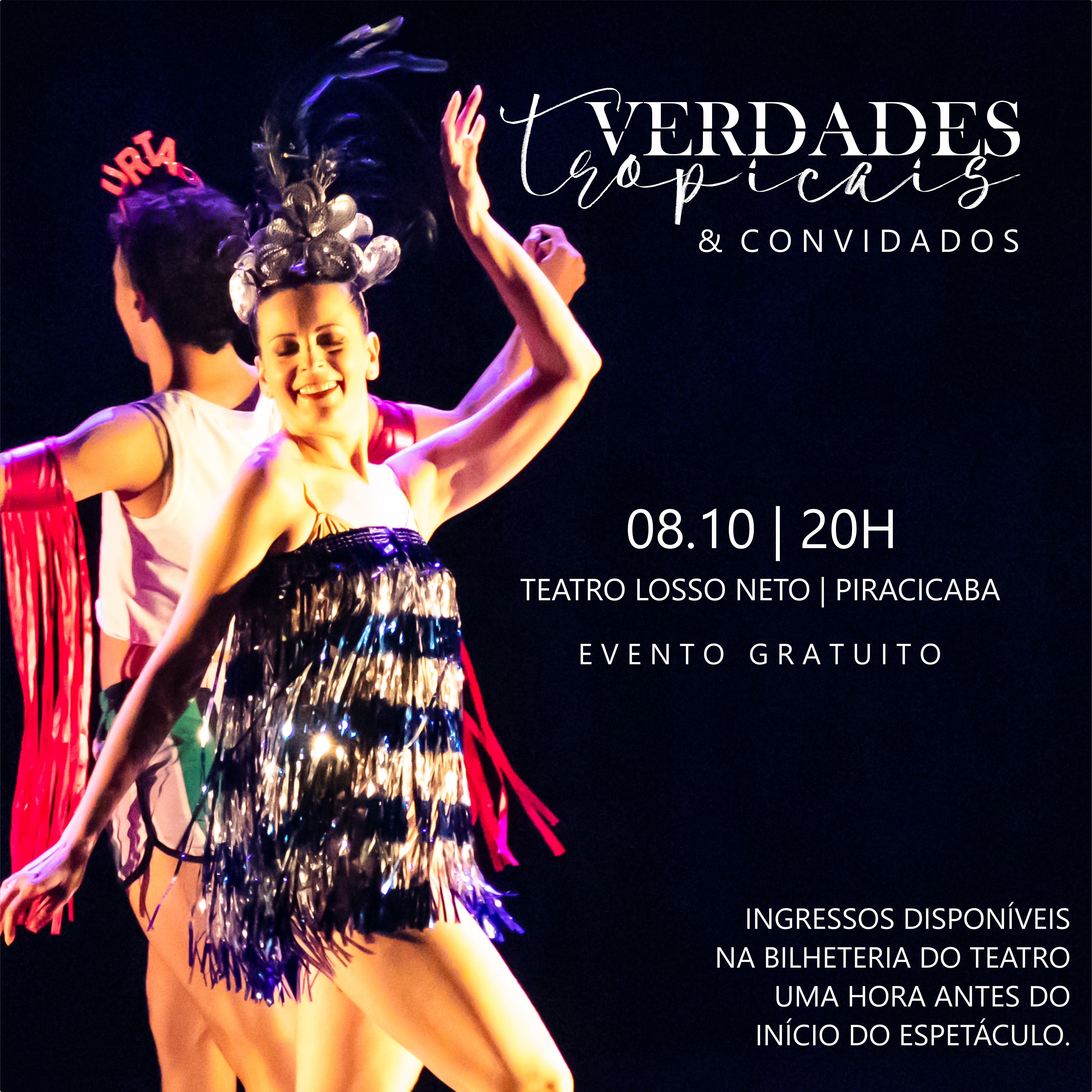 Teatro Dr. Losso Netto recebe o espetáculo Verdades Tropicais No elenco estão Ana Laura Bagarolo, Anna Elisa Egea, Chiara Pascon, Cíntia Nogueira, Daniel Margatto, Jenitton Anderson, Rafael Reis e Wender Lopes. Após a apresentação da obra o evento contará com a presença de grupos convidados que se juntarão ao Laboratório da Dança Fernanda Araújo em uma Gala com apresentações diversas de trabalhos premiados em festivais e em circulação na região. Dentre os convidados estão Cia Carina Castro, Clube de Campo de Piracicaba, Studio 415 e Twist – Grupo espaço Dançar.