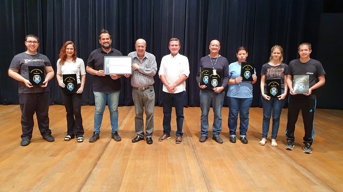 O Teatro Municipal Erotides de Campos recebeu Moção de Aplausos da Câmara Municipal, em cerimônia realizada na tarde de ontem, 28/03, no espaço. A comenda, de autoria do vereador Laércio Trevisan Jr., foi entregue ao secretário da Ação Cultural, Adolpho Queiroz, ao diretor do Teatro, Rubens Roncato, e a toda equipe de servidores, funcionários e colaboradores, em homenagem aos 10 anos de fundação e história do espaço, ocorrido em 27/03.