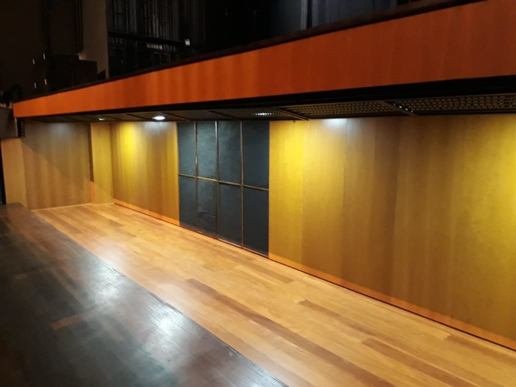 Foram realizados serviços de fornecimento e instalação de painel refletente, composto por estrutura revestida de compensado, proteção de fogo retardante, nicho e fechamento da lateral esquerda e paredes curvas; execução de 33,20 m2 de forro acústico com estrutura em madeira, revestimento em tecido e proteção de tratamento anti-chamas; além da elevação do piso na altura de 20 e 40 cm, com instalação de assoalho, conforme padrão existente no elevador da orquestra.