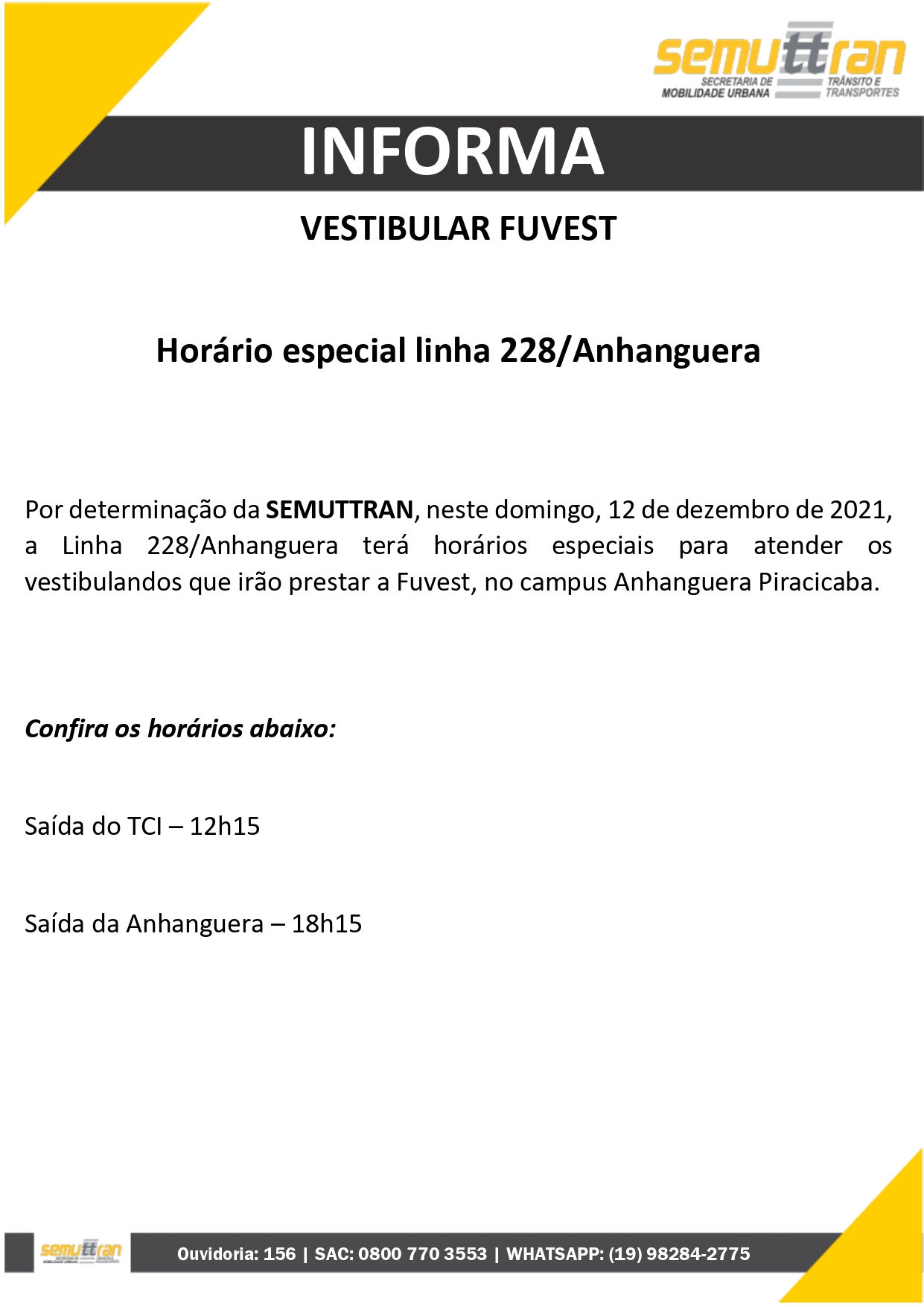 A Prefeitura de Piracicaba, por meio da Secretaria Municipal de Mobilidade Urbana, Trânsito e Transportes (Semuttran), vai disponibilizar neste domingo, 12/12, horários especiais no transporte coletivo para a linha 228/Anhanguera com objetivo de atender aos estudantes que vão prestar o vestibular da Fuvest no campus da Anhanguera Piracicaba.