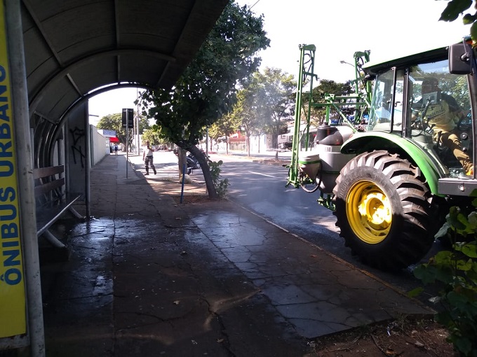 Nesta segunda-feira (20), o trator trabalhou na pulverização de pontos de ônibus em avenidas como Dr. Paulo de Moraes, Juscelino Kubitschek, Rui Barbosa, Dona Francisca e outras.