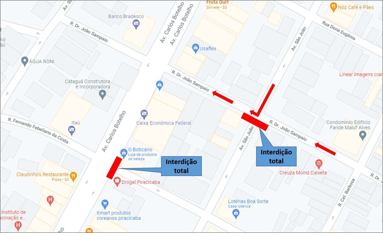 DESVIO – A orientação do Departamento de Trânsito da Semuttran é que os motoristas que trafegam pela São João convertam à direita na rua Dr. João Sampaio para acessar a avenida Carlos Botelho e outras vias do bairro.