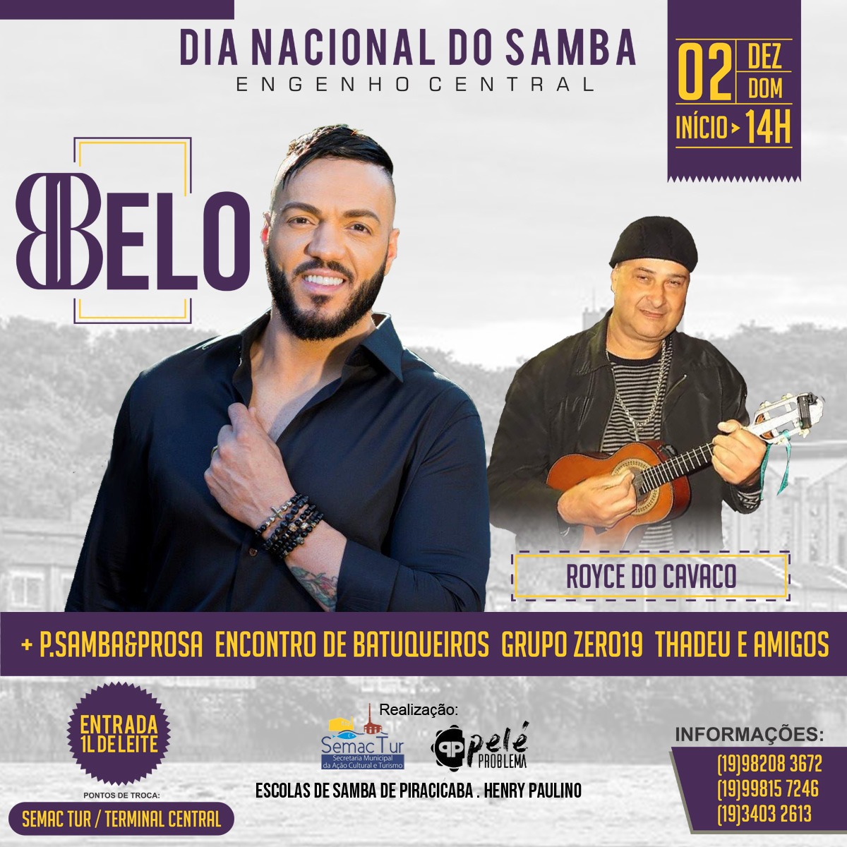 A troca de ingressos para o show dos cantores Belo e Royce do Cavaco, começa amanhã, 16/11, na Secretaria Municipal da Ação Cultural e Turismo (SemacTur). O Terminal Central de Integração e alguns pontos das regiões leste, sul e norte de Piracicaba também serão postos de troca. As atrações celebrarão o Dia Nacional do Samba, 02/12 (domingo), a partir das 14h, no Engenho Central. Cada ingresso será trocado por 1 litro de leite Longa Vida. O evento contará ainda, com a participação do grupo Samba & Prosa, Zero19, Thadeu e Amigos e Encontro de Batuqueiros.