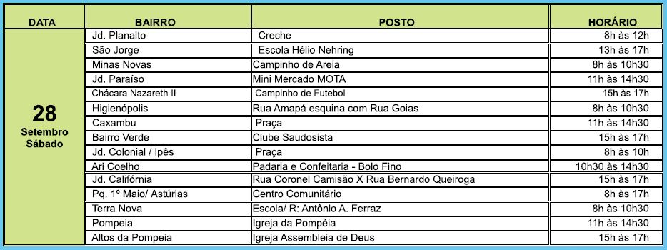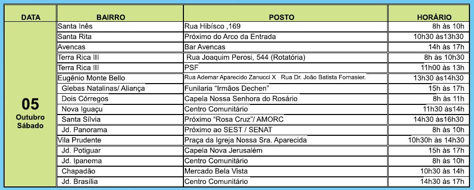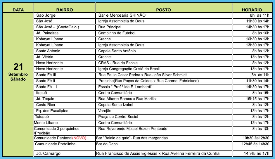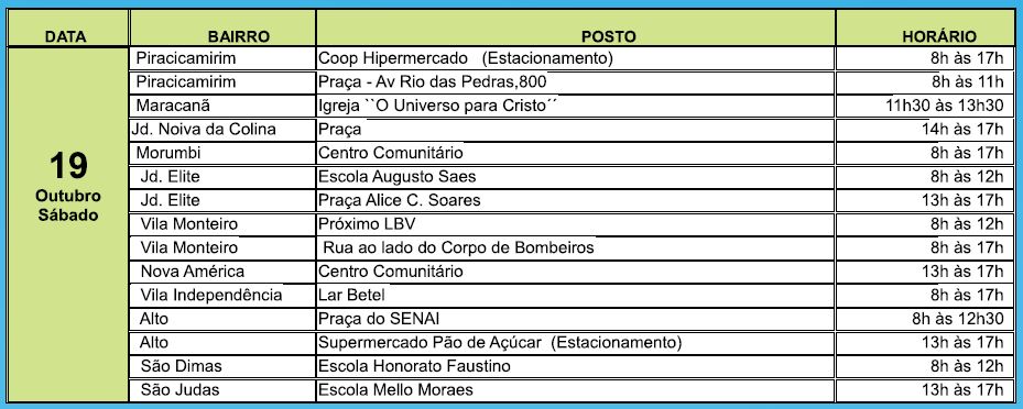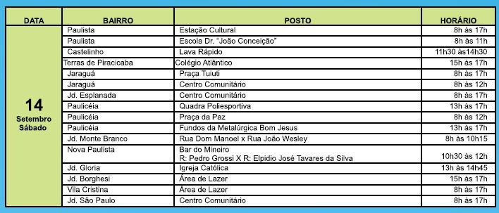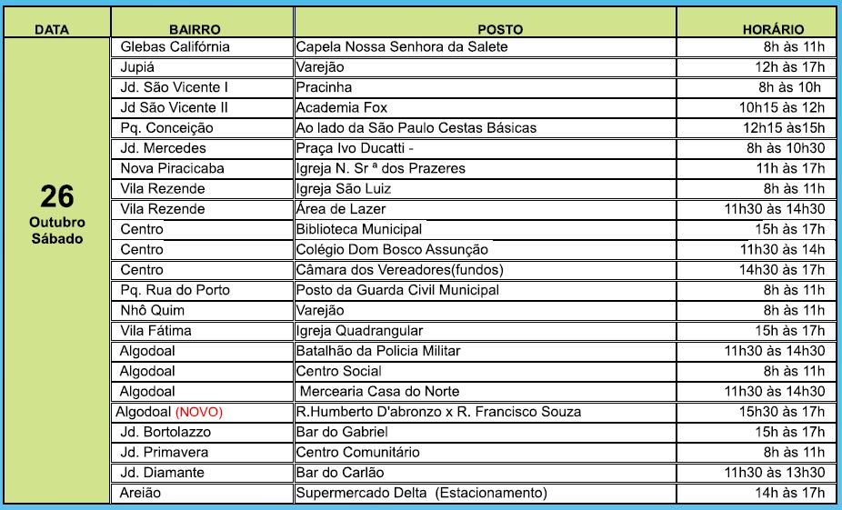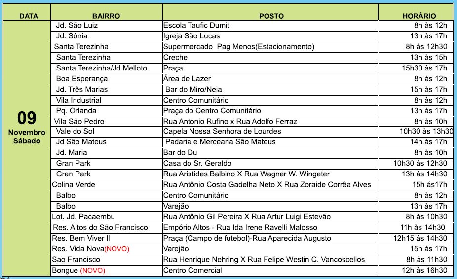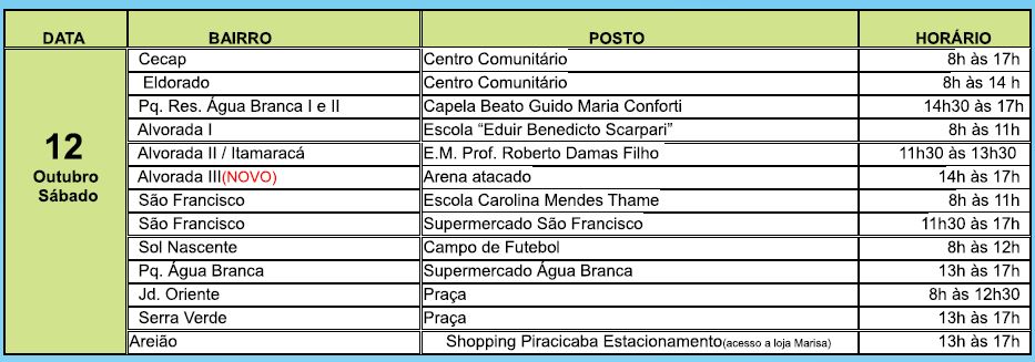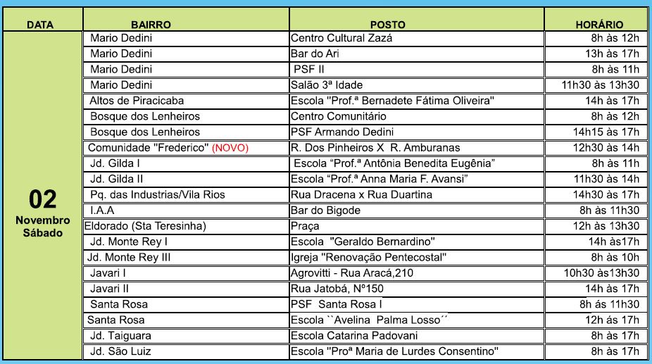 Confira as tabelas com dias e locais de vacinação por toda a cidade: