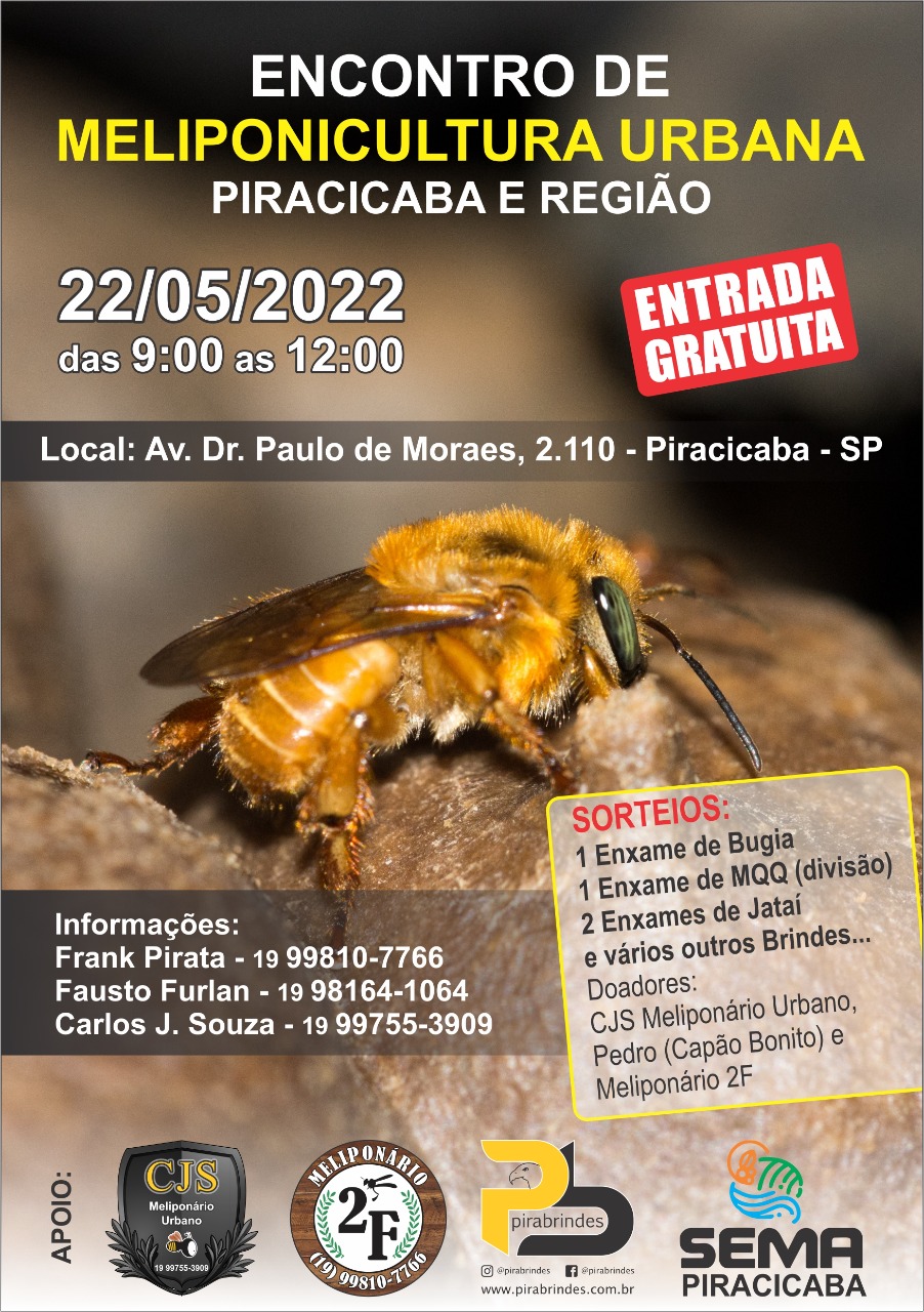 A Prefeitura de Piracicaba, por meio da Sema (Secretaria Municipal de Agricultura e Abastecimento), apoia o Encontro de Meliponicultura Urbana Piracicaba e Região, que ocorre neste domingo, 22/05, no Varejão da Paulista, das 9h às 12h.