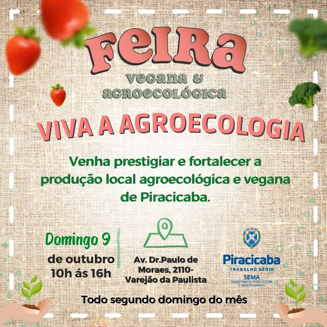 Em parceria com a Prefeitura, por meio da Sema (Secretaria Municipal de Agricultura e Abastecimento), acontece neste domingo, 9/10, a Feira Vegana e Agroecológica no Varejão da Paulista, das 10h às 16h.