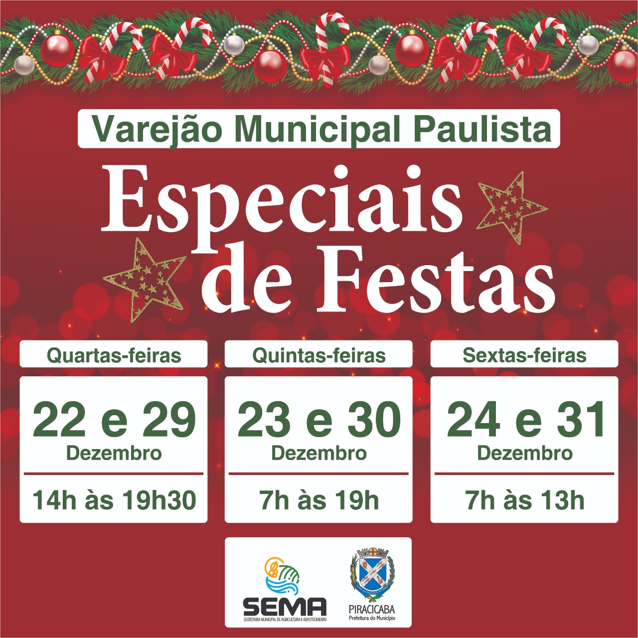 Com exceção dessas datas, os varejões municipais funcionarão normalmente nas duas últimas semanas do ano, inclusive aos domingos (26/12 e 02/01), de acordo com a programação fixa. A lista completa dos varejões, horários e locais pode ser conferida no site www.sema.piracicaba.sp.gov.br, ou pelo instagram @sema.piracicaba.
