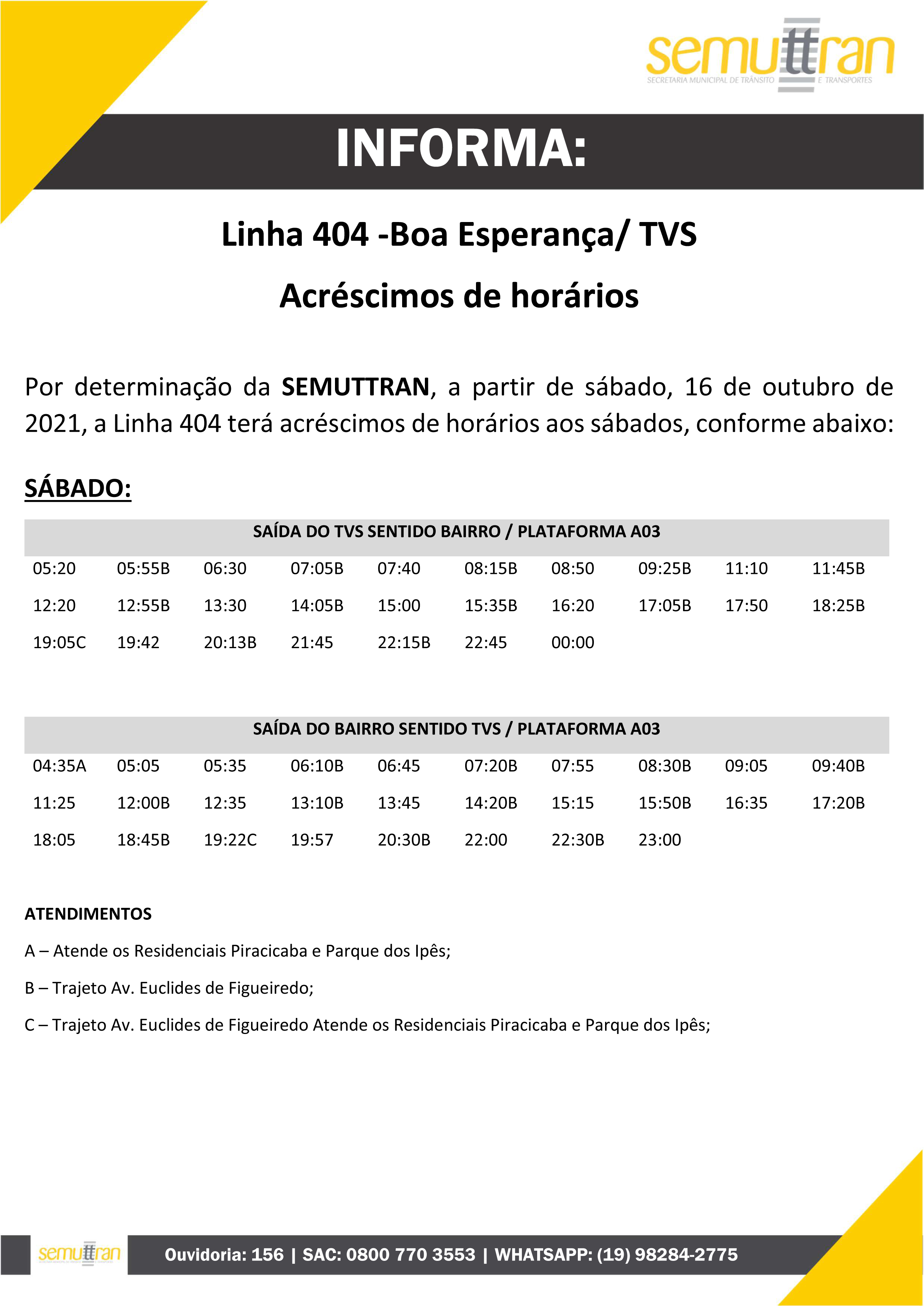 Os usuários do transporte coletivo que utilizam as linhas de ônibus 404 Boa Esperança/TVS e 414 Ipês/TVS passarão a contar, a partir do dia 16/10, com novos horários aos sábados. A medida atende estudos realizados pela Secretaria de Mobilidade Urbana, Trânsito e Transportes (Semuttran), que vem identificando a retomada da demanda dessas linhas.