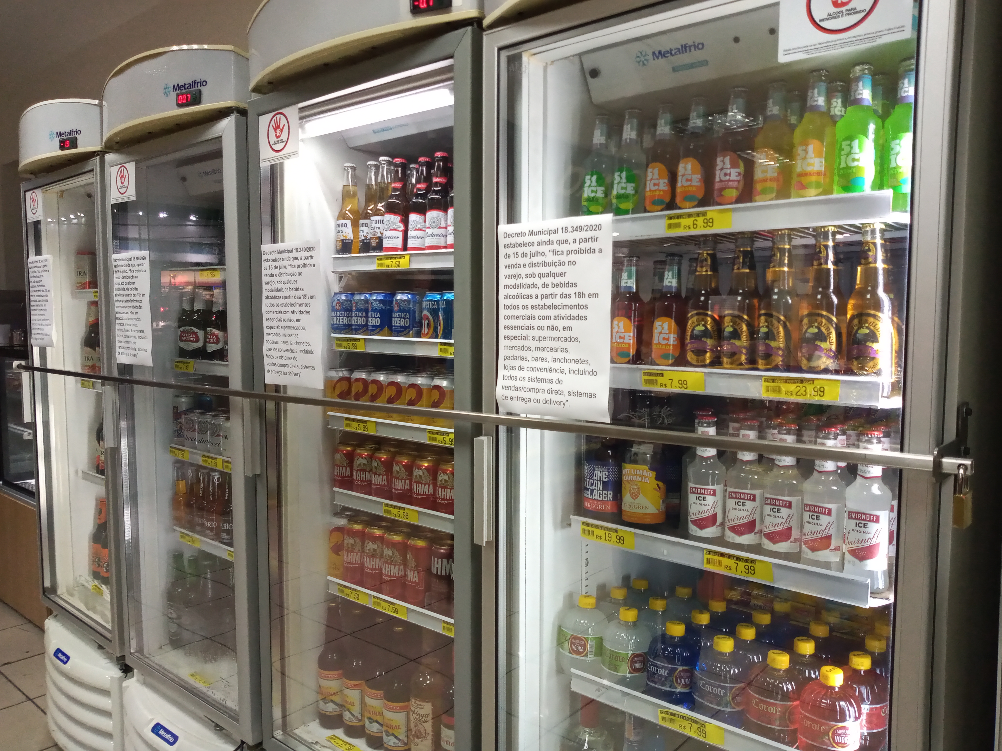 Proprietários lacraram geladeiras onde estavam as bebidas alcoólicas geladas: proibidas após as 18h