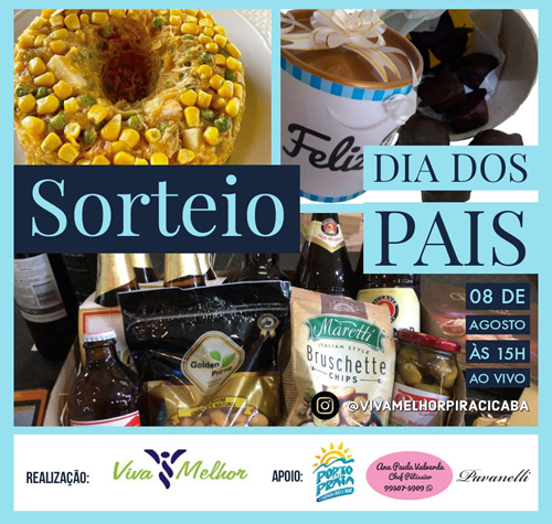 Em comemoração ao Dia dos Pais – no domingo 09/08, o Grupo Viva Melhor, do Ipasp (Instituto de Previdência e Assistência Social dos Funcionários Municipais de Piracicaba), realiza um sorteio especial e virtual no próximo sábado (08/08), às 15h, em seu Instagram – @vivamelhorpiracicaba. Na ocasião, haverá o sorteio de três prêmios: 1º prêmio – uma cesta especial da Lojas Pavanelli 2º prêmio – um cuscuz médio de frango do Restaurante Porto da Praia 3º prêmio – duas caixas com 180 gramas (cada) de brownie de chocolate ao leite da chef patissier Ana Paula Valverde A coordenadora do Viva Melhor, Carmem Carlet, explica que a participação no sorteio é simples. “Qualquer pessoa pode participar. Para isso, basta procurar a foto oficial do sorteio que está publicada no perfil @vivamelhorpiracicaba no Instagram e seguir algumas regras”. As regras para participação são: – Curtir a FOTO OFICIAL (se encontra no perfil do Viva Melhor no Instagram) – Seguir os perfis: @vivamelhorpiracicaba @portodapraiarestaurante @ana.paula.valverde86 @arnonicarlet @janinediorio – Comentar marcando 1 amigo por comentário (não vale perfis fakes, famosos ou profissionais) – Pode comentar quantas vezes quiser, com pessoas diferentes a cada comentário. Carmem explica ainda que o perfil do ganhador deverá estar desbloqueado no dia do sorteio para ser conferido. “Caso o ganhador não tenha cumprido alguma das regras, será desclassificado e um novo sorteio será realizado. Os prêmios serão entregues em Piracicaba, são intransferíveis e não podem ser trocados por valor em dinheiro”, ressalta. O sorteio conta com o apoio do Restaurante Porto da Praia, da chef pâtissier Ana Paula Valverde e da Lojas Pavanelli.