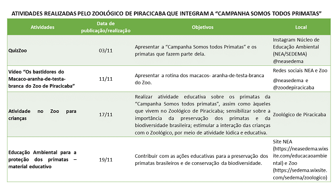 O Zoológico de Piracicaba participa, durante o mês de novembro, da Campanha educativa "Somos Todos Primatas". Diversas atividades educativas, com postagens nas redes sociais, elaboração de vídeo, divulgação de cartilha sobre os primatas e atividade presencial para crianças de 08 a 10 anos, têm o intuito de sensibilizar o público sobre a importância da conservação desses animais. O Brasil possui a maior biodiversidade de primatas do mundo, porém muitos estão ameaçados de extinção devido à destruição das florestas, causadas em grande parte pelo desmatamento.