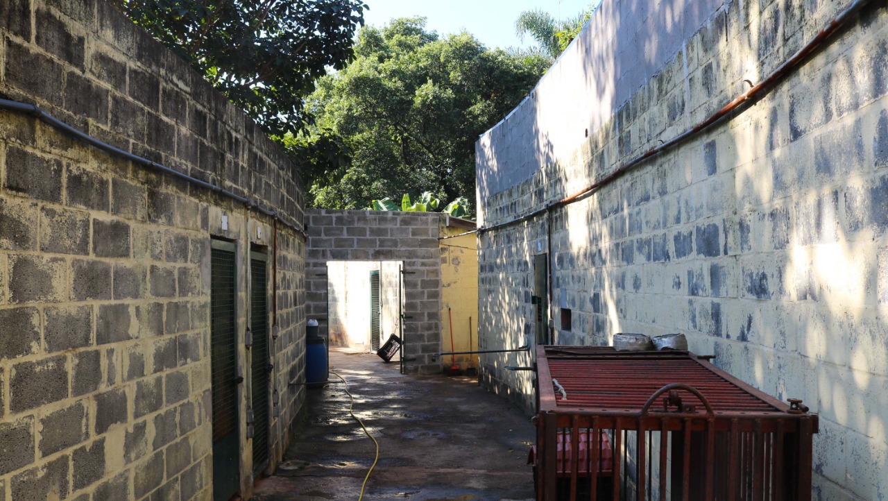 Parede externa dos recintos danificada pela falta de calha e de pintura impermeável