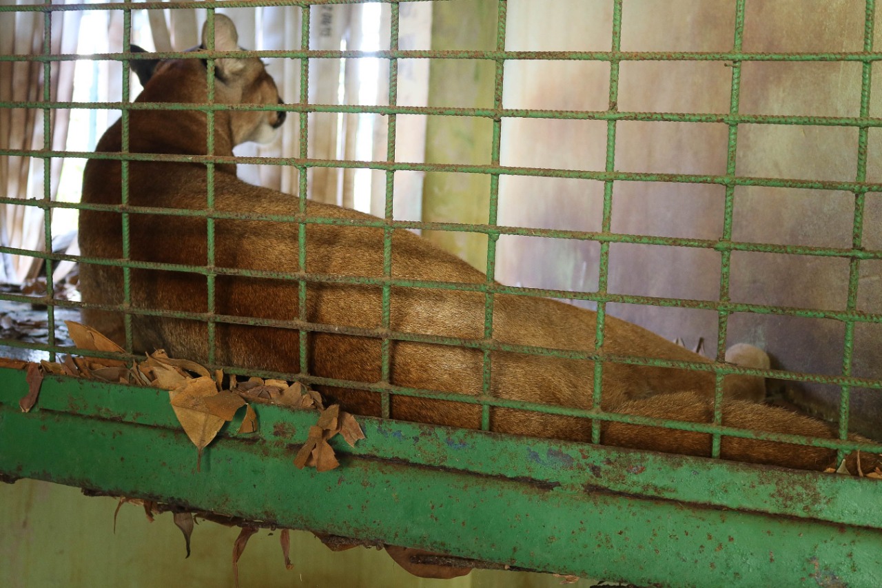 Camila mostra desgaste do recinto, que precisa ser recuperado, por conta da urina do gato do mato