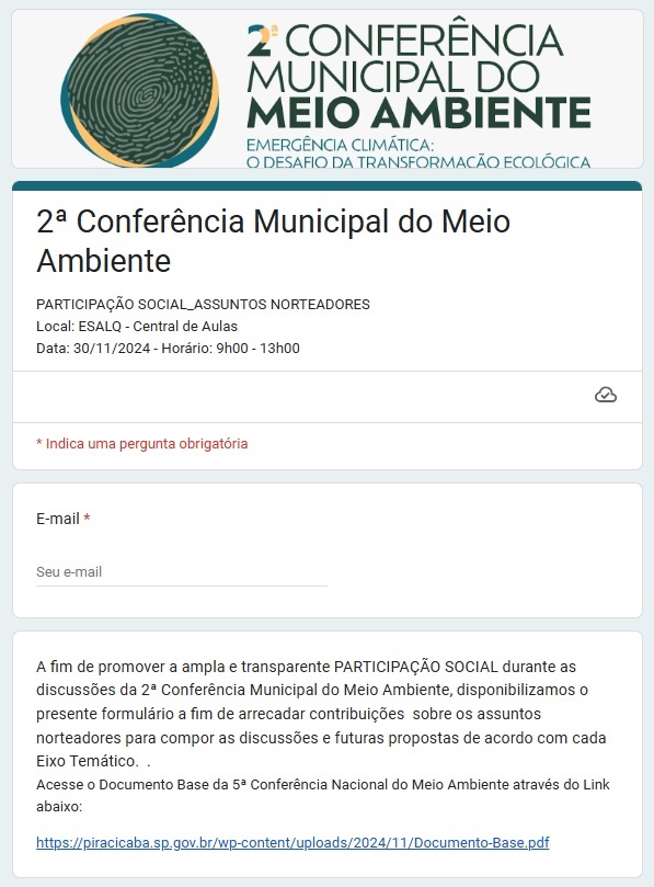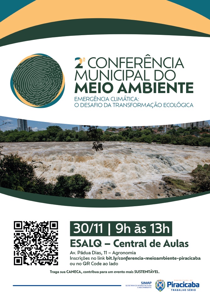 A Prefeitura do Município de Piracicaba, através do Decreto nº 20.200 de 31 de Outubro de 2024, convoca a 2ª Conferência Municipal do Meio Ambiente, a ser realizada no dia 30 de novembro de 2024, no horário das 9h às 13h, tendo como tema central: “Emergência climática: o desafio da transformação ecológica”, em conformidade com a Portaria GM/MMA nº 1.079, de 10 de junho de 2024, expedida pelo Ministério do Meio Ambiente e Mudança do Clima, que convocou a 5ª Conferência Nacional do Meio Ambiente.